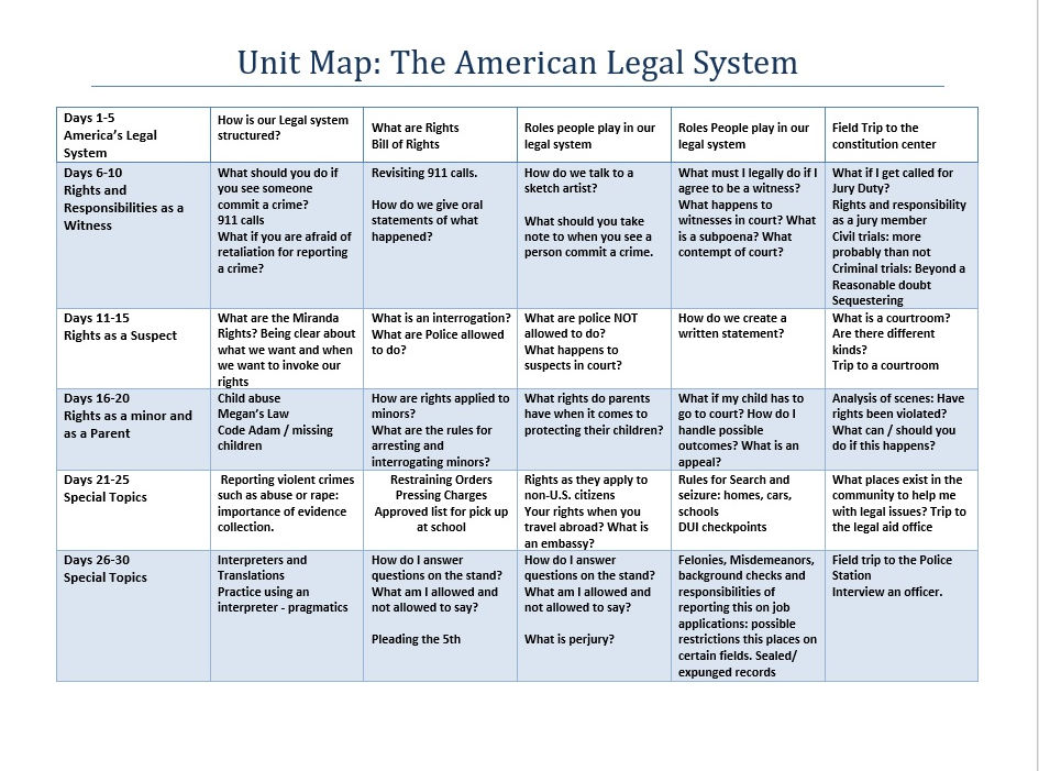 The unit of study outlined on this website should be used as a reference for the trajectory of the unit and not as a definitive time line. Topics should be expanded appropriately as per the needs of the learners in each class. Some topics and themes may require more time than indicated on the calendar, so this unit plan has been designed with that flexibility in mind. The goal of this unit is depth of comprehension of the many legal topics and situations which impact the lives of our learners directly. The integrity of that flexibility should be respected and maintained for optimum learning